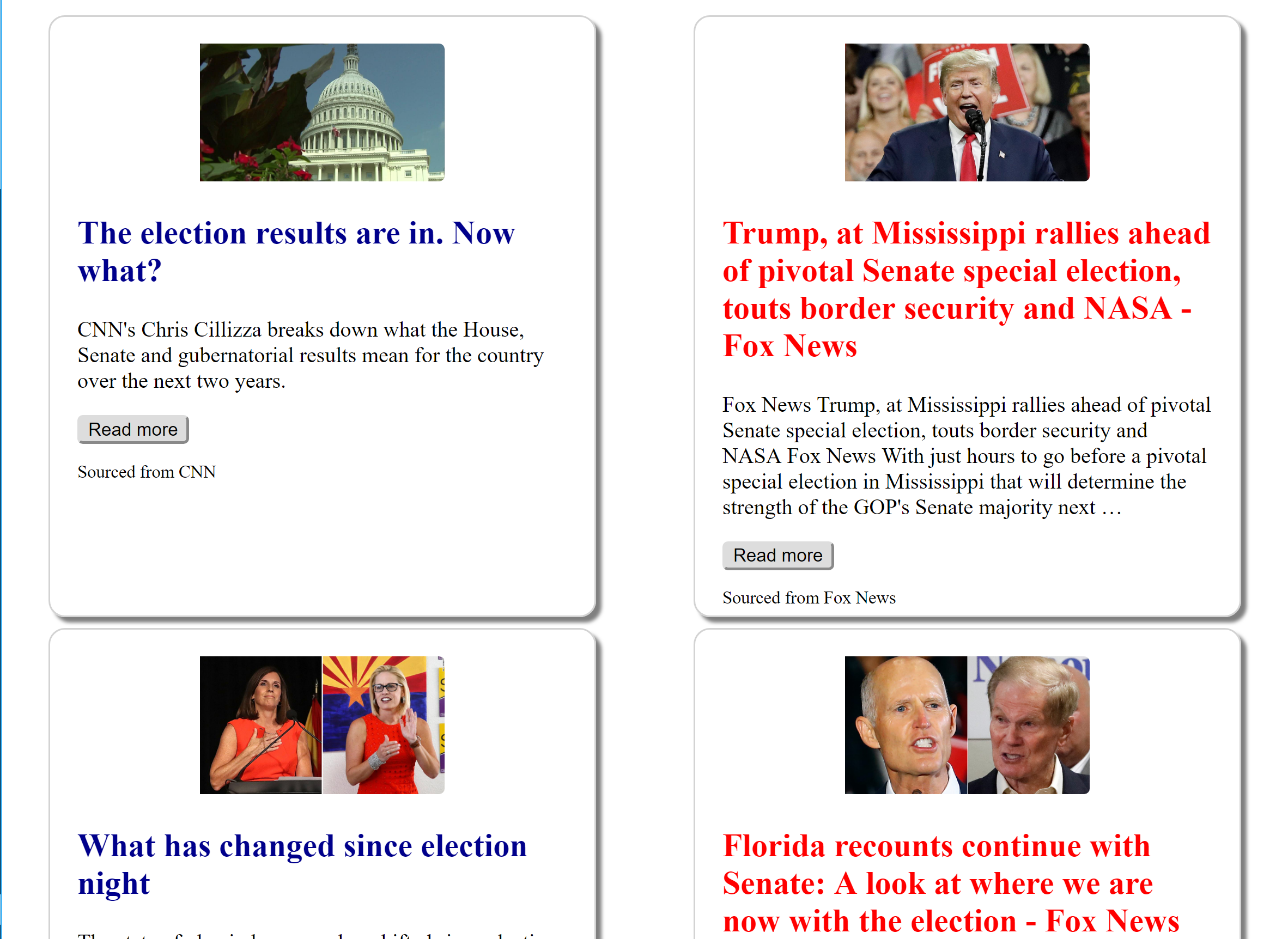One of my first React projects was designed to consume a free news API and display articles side-by-side from different sources, to display the starkly different treatment of the same topics in news. I have kept this project for display purposes, but I found that this created a false equivalency in journalism, as for some reason far-right news sources have much more easily accessible APIs than far left. I may revisit this project in the future.